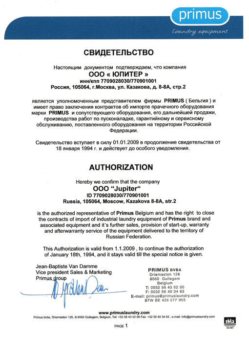Официальный представитель ведущего европейского производителя прачечного оборудования PRIMUS (Бельгия) с 1994 года. Наша компания специализируется на поставках промышленного стирального оборудования, имеет собственную сервисную службу, склад оборудования и запасных частей, осуществляет гарантийное и послегарантийное сервисное обслуживание.